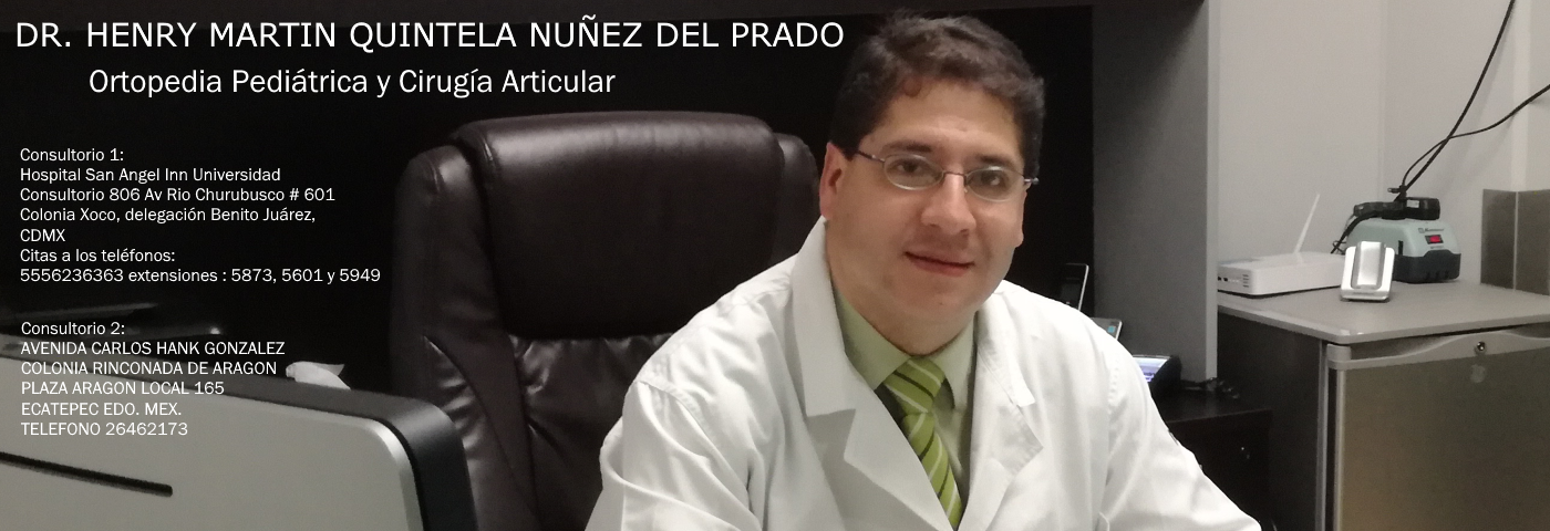 Dr. Henry Quintela Nuñez del Prado Ortopedista y Traumatólogo. Alta especialidad en Ortopedia Pediátrica. Hospital San Ángel Inn Universidad Av. Río Churubusco 601, Xoco, Benito Juárez, 03330 Ciudad de México. teléfonos: 5556236363 extensiones : 5873, 5601 y 5949
